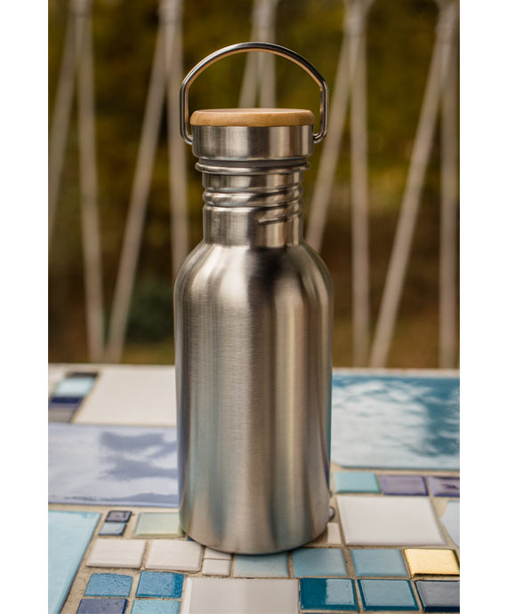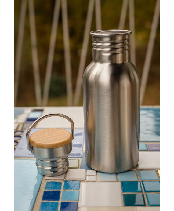 Einwandige Edelstahlflasche mit grosser Öffnung und Edelstahl/Bambusverschluss. Stylische Flasche für den "Jeden Tag" Gebrauch. Veredelung: Druck, Gravur Material: Edelstahl, Bambus