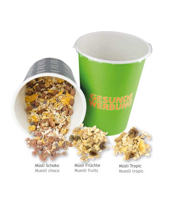 Inhalt: Bio-Müsli Früchte: Haferflocken* grob, Roggenflocken*, Rosinen* 10%, Würfelmischung Frucht* 8% (Birnen*, Datteln*, Feigen*, Äpfel*, Aprikosen*, Trennmittel: Reismehl*), Leinsaat*, Gerstenflocken*, Sonnenblumenkerne*, Birnenwürfel* 4%; Bio-Müsli Tropic: Haferflocken* grob, Weizenflocken*, Roggenflocken*, Gerstenflocken*, Sultanas*, Bananenchips*, Mangowürfel*, Ananaswürfel*, Papayawürfel*, Sonnenblumenkerne*, Leinsaat*; Müsli Schoko: Haferflocken* fein 40%, Weizenflocken* 20%, Cornflakes Schoko* 13% (Cornflakes* 58% (Mais*, Rohrohrzucker*, Meersalz, Maismalz*), Rohrohrzucker*, Kakaobutter*, Kakaomasse*, Vollmilchpulver*, Überzugsmasse: Gummi Arabicum*), Cornflakes Vollkorn* (Mais*) 10%, Schokocrisps* 10% (Reis*, Weizen*, Hafer*, Gerste*, Rohrohrzucker*, Kakao*, Gerstenmalz*), Schokostücke Zartbitter* 4% (Kakaomasse* 60%, Rohrzucker*, Sojalecithine*, Vanilleextrakt* 0,01%), Kokosraspel* 3%; Mindestmenge 500 Stk. Haltbarkeit 12 Monate Netto-Gewicht ca. 70 g oder 45 g Verpackungstyp Pappbecher mit Schutzfolie Format D 90 x L 110 mm Werbefläche gemäss Stanzskizze Lieferzeit ca. 3-4 Wochen ab Druckfreigabe Druckart Digitaldruck