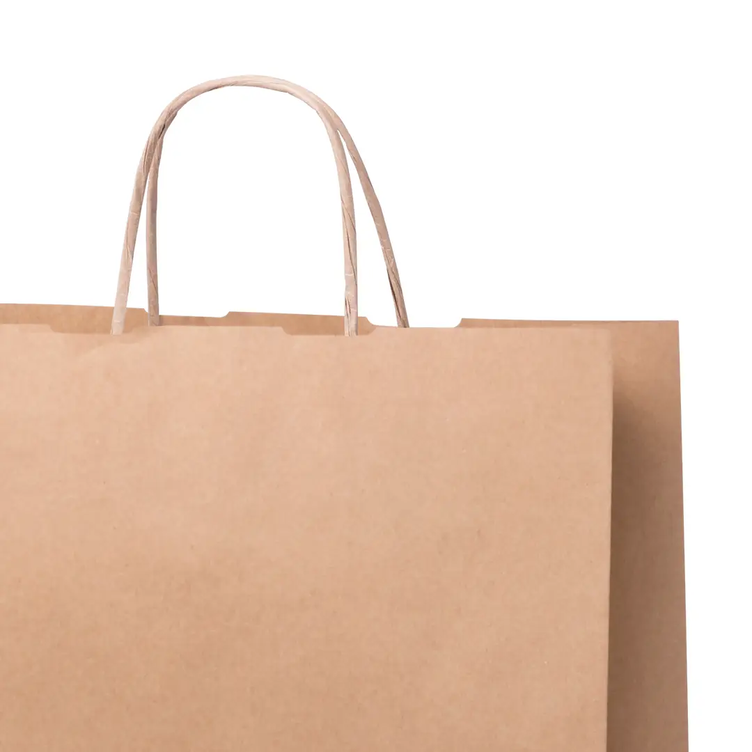 Papiertasche mit natürlicher Oberfläche aus 100 g/m². Mit kurzen, verstärkten Griffen sowie Boden- und Seitenfalte. Belastbar bis zu 7 kg.