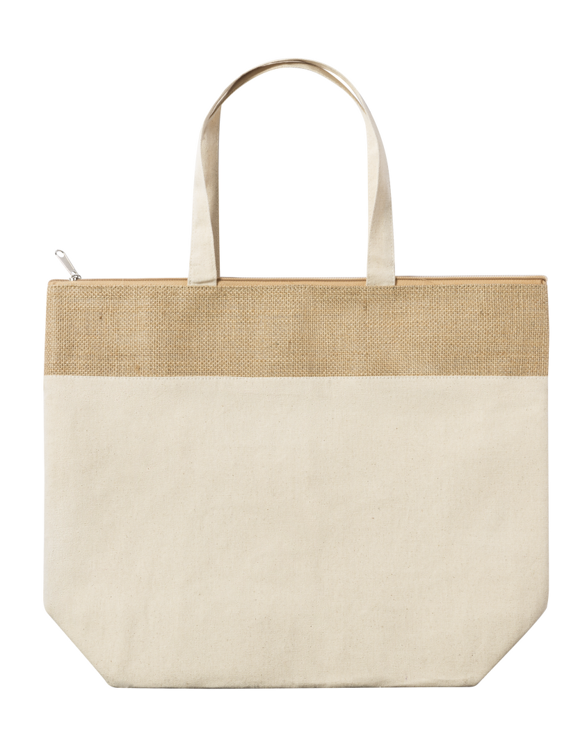 Thermotasche aus widerstandsfähigem Baumwollmaterial von 225g / m2, mit laminiertem Juteoberteil und Baumwollgriffen. Hauptfach mit Reißverschluss und Metallschieber, mit isothermer Aluminium-Innenausstattung. Genähtes Finish, mit verstärkten mittleren Griffen und einer Widerstandsfähigkeit von bis zu 7 kg.